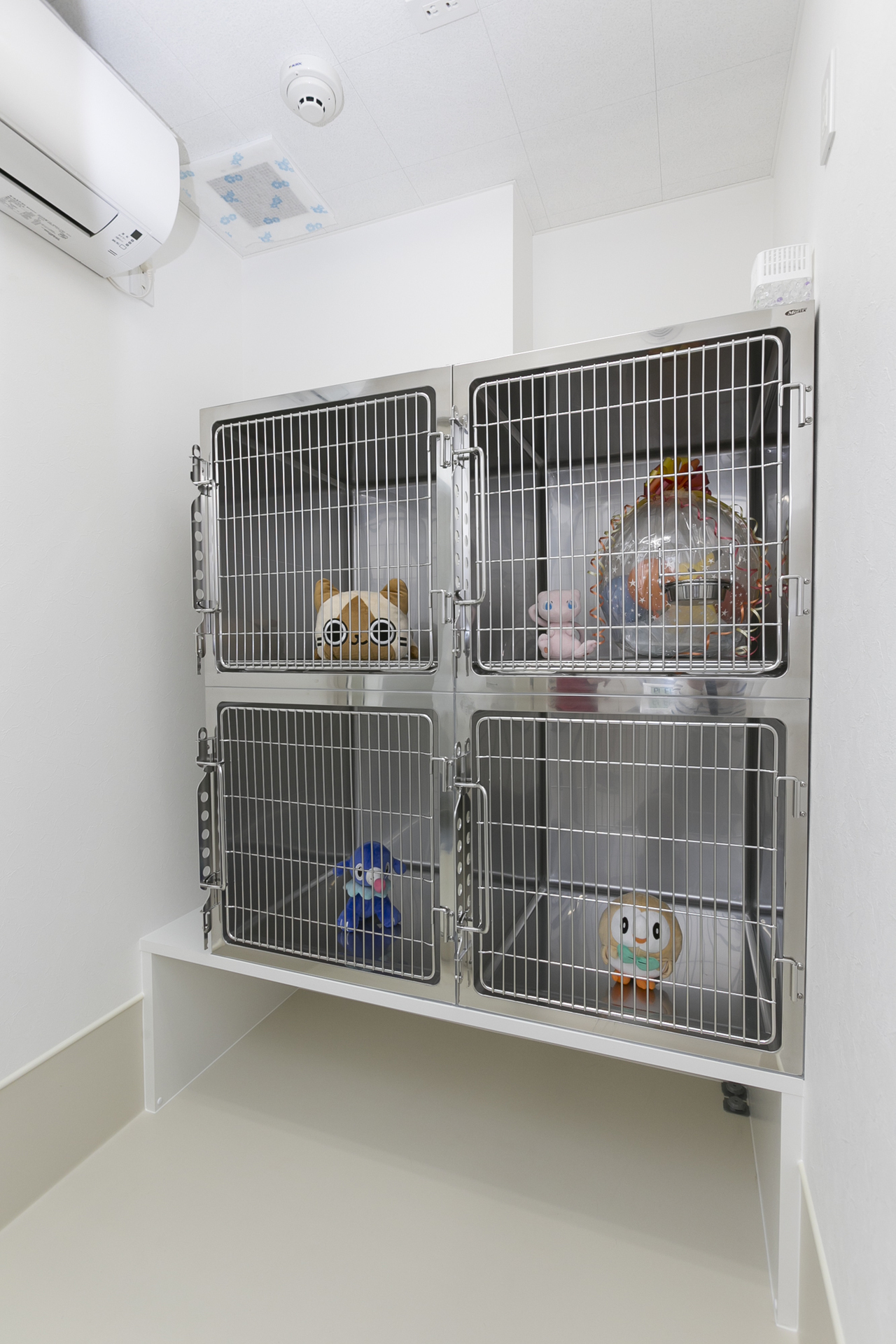ワンちゃんの入院&HOTELの部屋です。 冷暖房・防音完備。 状況によりケージを増やせるよう、奥にスペースを確保しています。